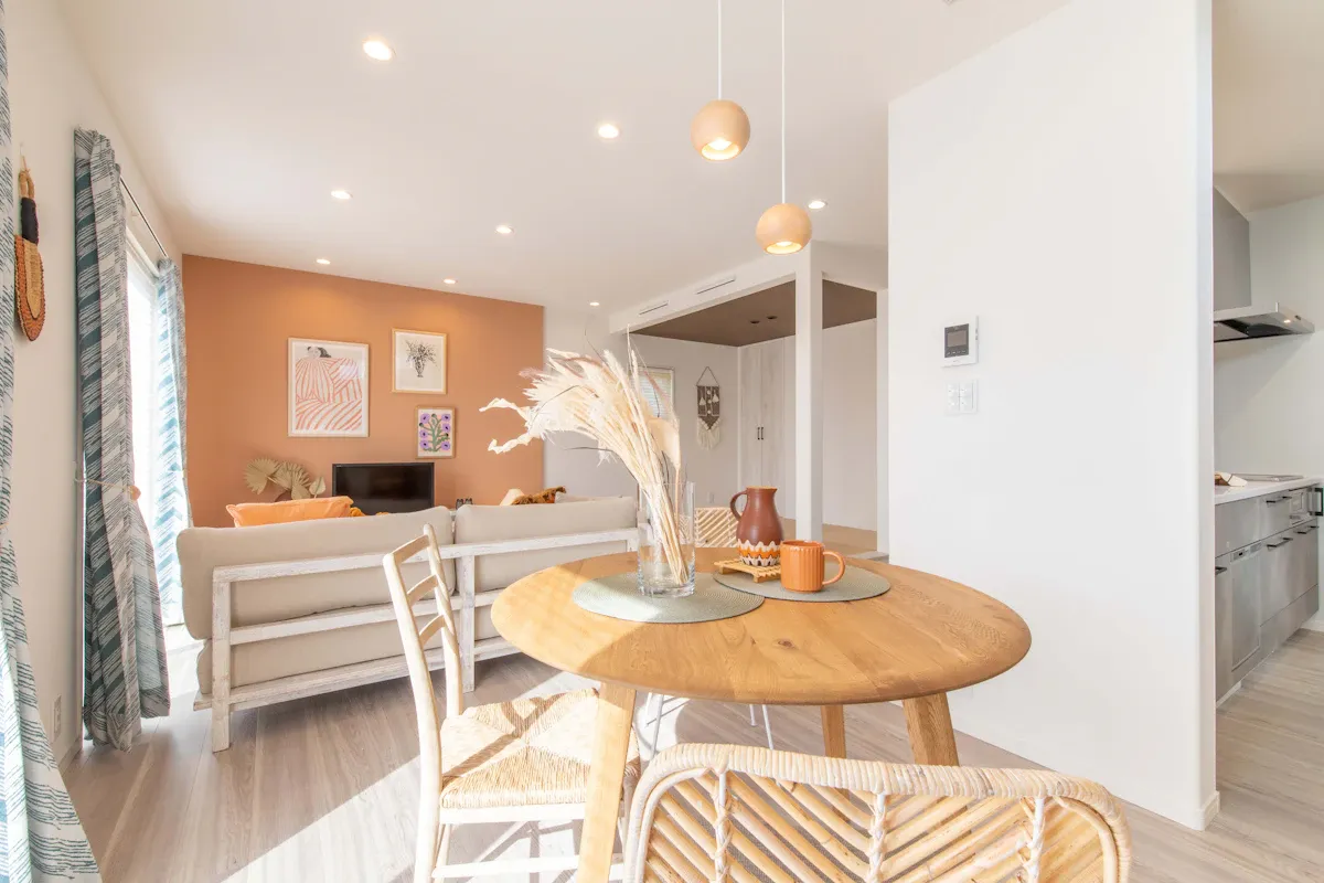 淡いカラーの壁面と自然素材を組み合わせ、シンプルでリラックスできる空間に。