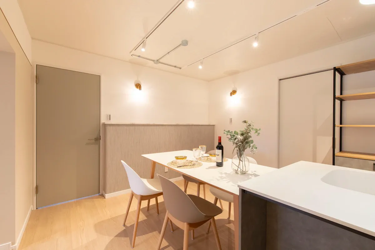 白い塗り壁と無垢フローリングの調和が心地よく、家族みんながくつろげる空間を演出します。