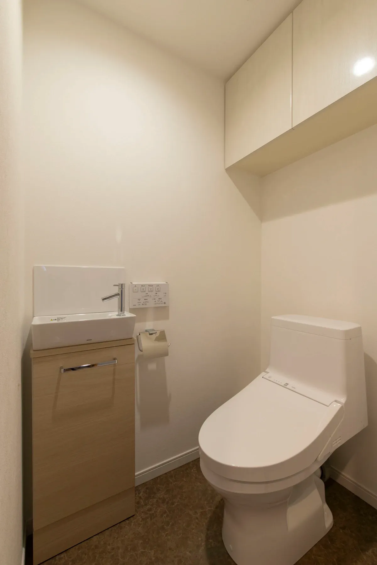 ワイドな洗面化粧台を設置。鏡を開けると収納になっていて、家族の日用品がたっぷりと収納できます。
