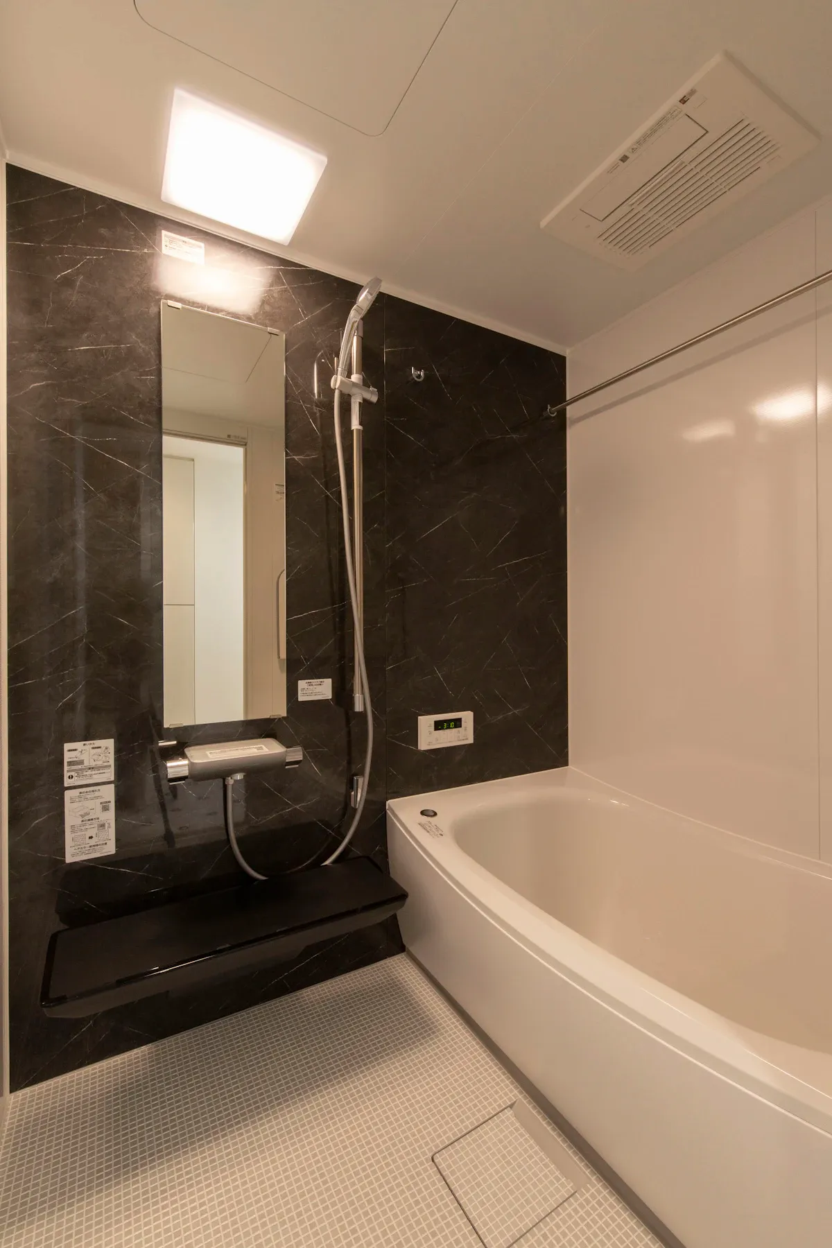 黒のアクセントパネルが特徴的なユニットバスを採用しました。落ち着いた印象でゆっくりと入浴時間をお楽しみいただけます。