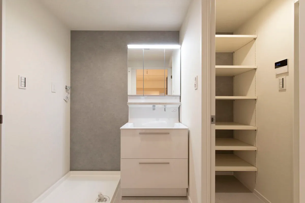 洗面スペースと脱衣スペースを分け、脱衣スペースには可動棚を設置。タオルや着替えなどを収納いただけます。