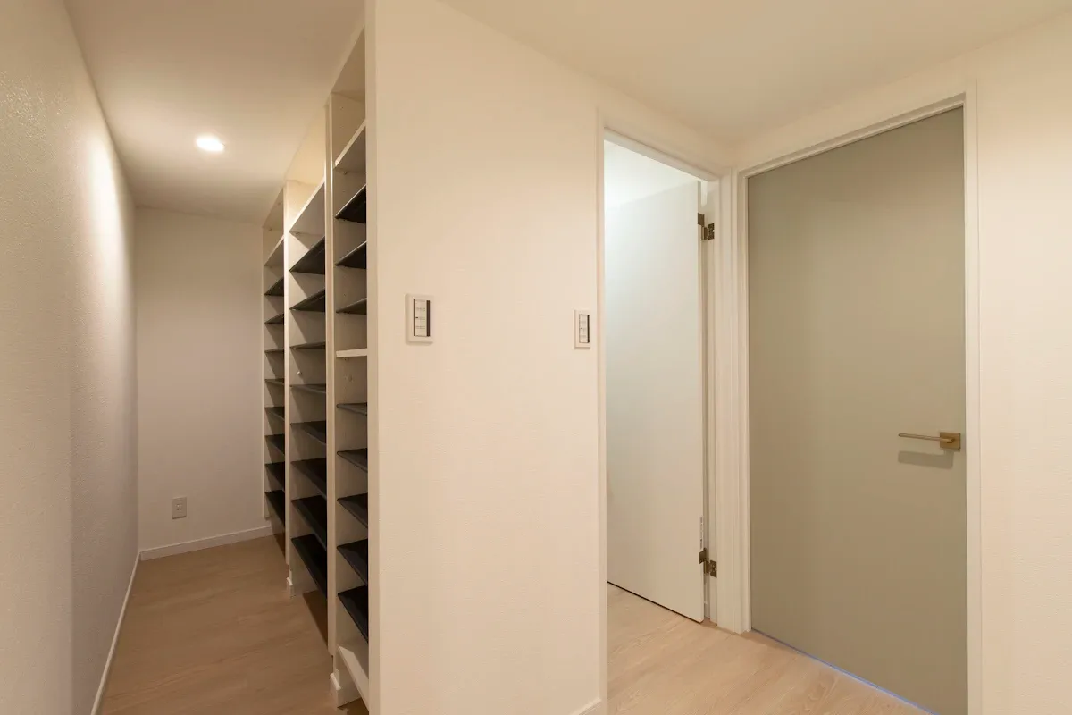 玄関スペースにもシューズクロークと収納スペースを設置しました。アウトドア好きの方や、靴好きの方にはもってこいの収納スペースです。