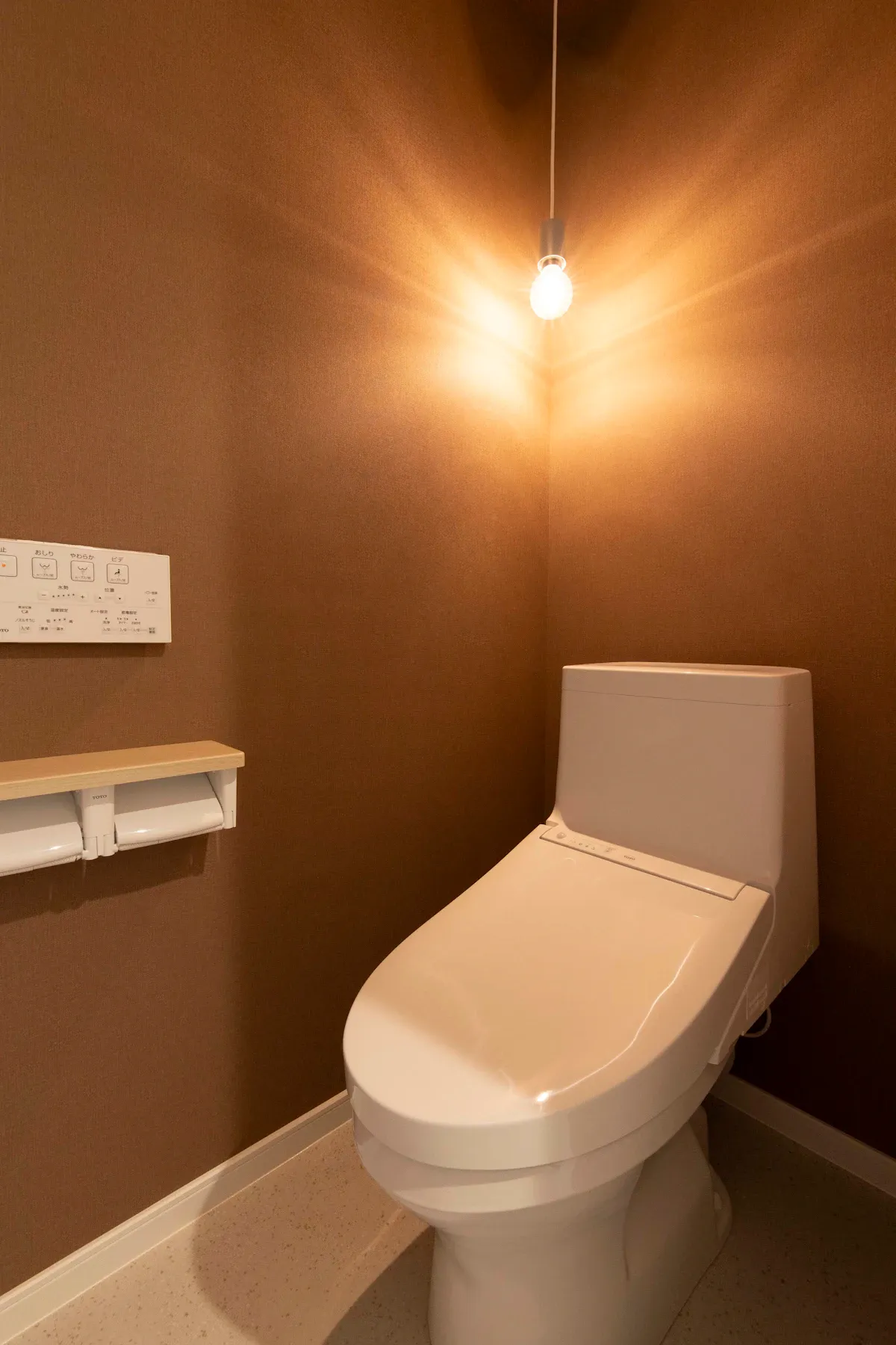 アースカラーの壁紙を採用し、落ち着いた雰囲気のトイレに。裸電球の照明で心が休まる空間になりました。