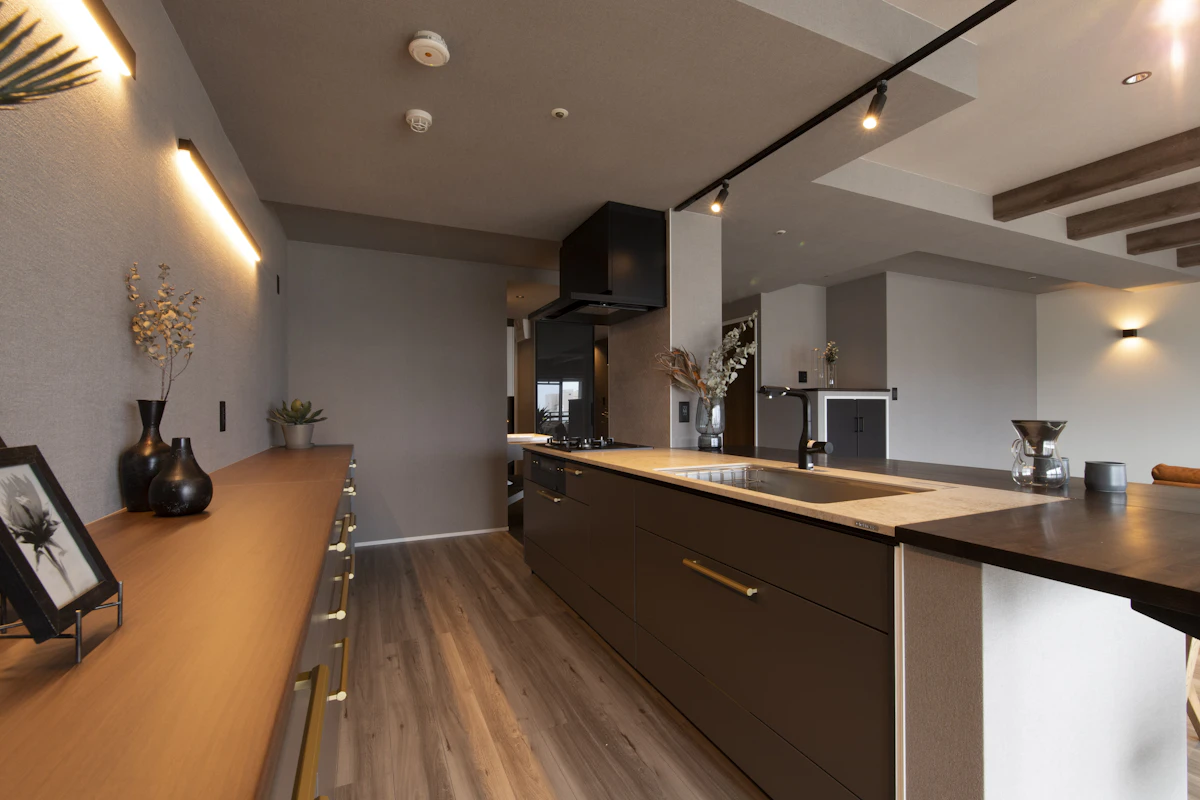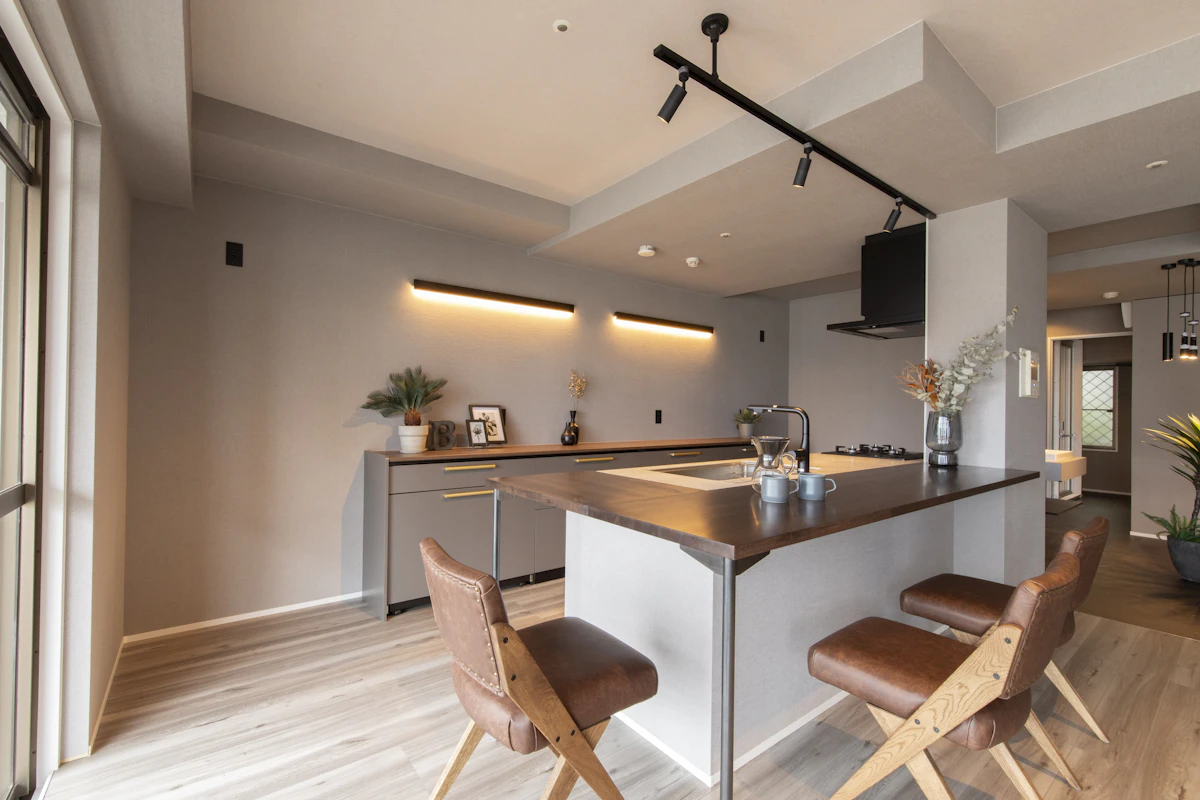 キッチンを囲むように、ダイニングテーブルを兼ねたL型のカウンターを造作。まるでダイニングバーで食事を楽しむかのような雰囲気が味わえます。