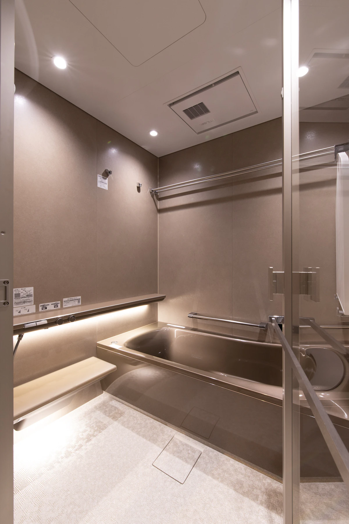 浴室も位置を変更しサイズを広げ、ゆったりとくつろげる空間に。透明なドアを用いたことでより開放的に感じられます。