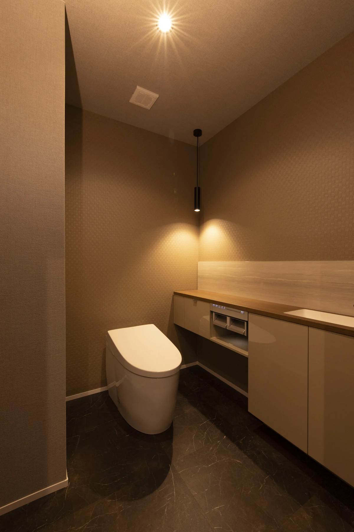 トイレは位置を変更し、広く落ち着ける空間に仕上げました。見た目のすっきりさと清掃性を兼ね備えたタンクレスのトイレを採用しました。