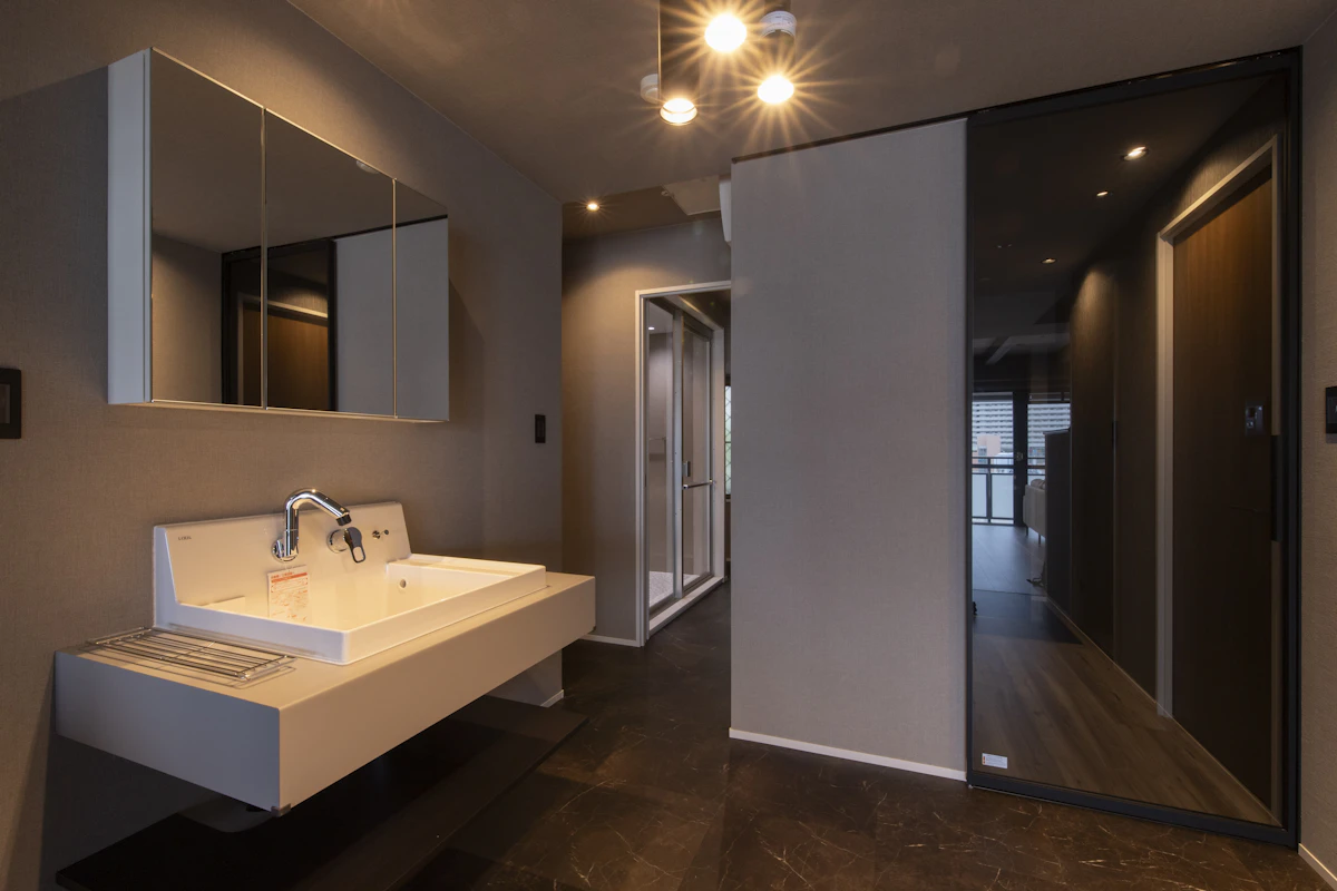 洗面コーナーは、浴室や脱衣スペースから切り離しLDKの入り口に設置しました。