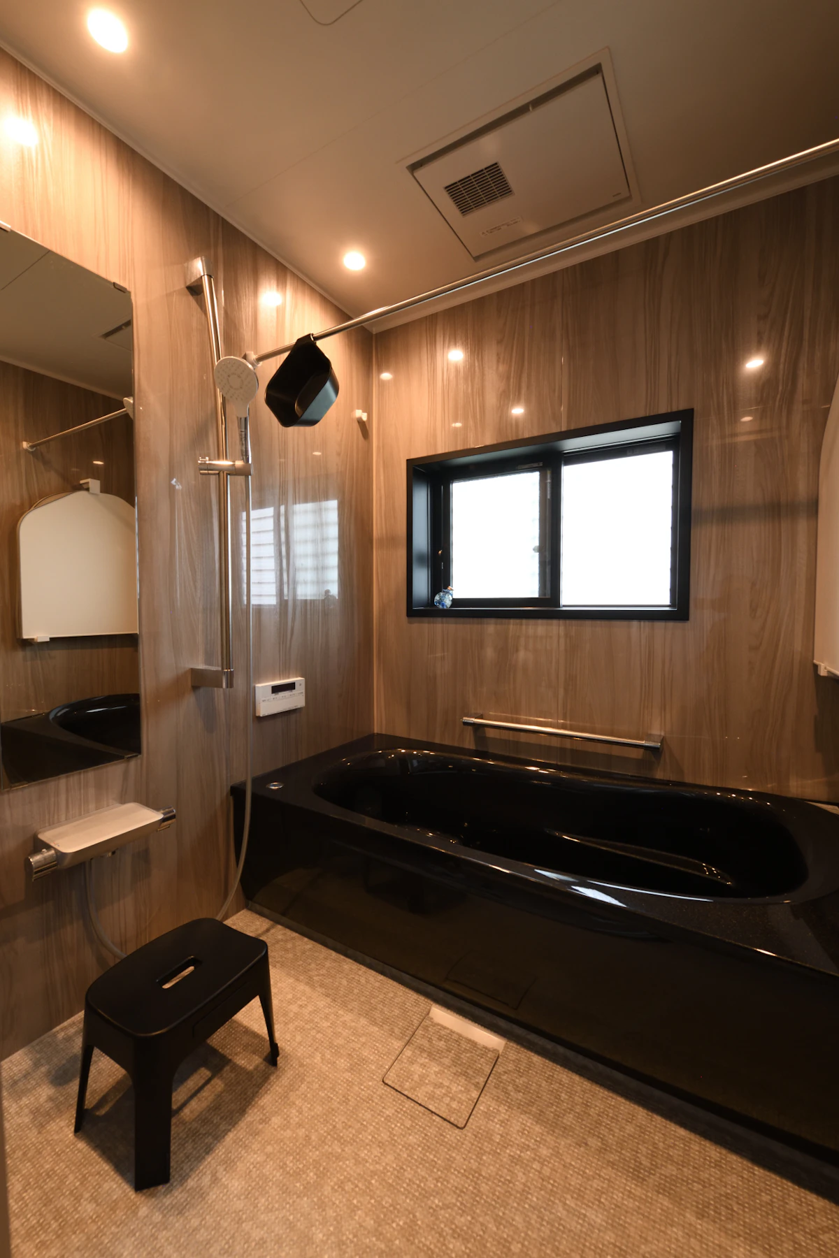 水回りは、浴室・洗面台・トイレをすべてTOTO製品で統一。実際にショールームで確認しながら選定し、落ち着いた雰囲気のデザインに仕上げました。特に浴槽は黒色を選び、上品で引き締まった印象になっています。